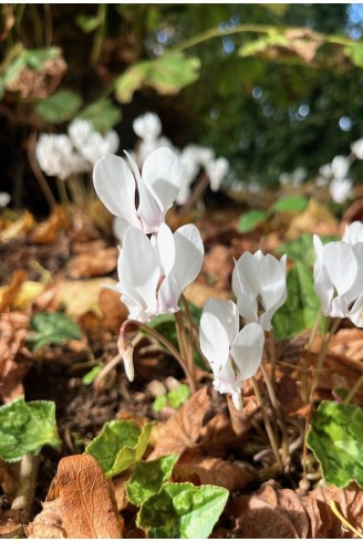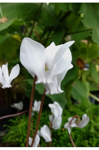 La forme blanche de ce Cyclamen se cultive en sous-bois et se naturalise facilement, même en sol sec ou calcaire.