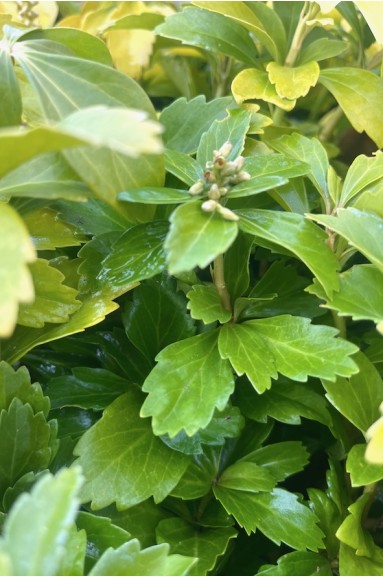 Plante au feuilles vert foncé, irrégulèrement dentelées, coriaces et brillantes de 5 à 10 cm de long réunies en bouquets à l'extremité des rameaux. Elle porte à l'entrée de l'été des fleurs blanches très petites et légèrement parfumées. De croissance moyenne, elle pousse sans envahir en développant des stolons souterrains et produit ainsi de beaux coussins denses sous lesquels les plantes indésirables ne se développent pas!
