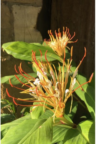 Les Hedychium sont des plantes vivaces herbacées qui se développent grâce à leur système racinaire rhizomateux. Leur feuillage caduque pousse jusqu'à 1,50 m en une saison, c'est ce qui explique leur besoin important en matière organique et en eau pendant la période de croissance. Les feuilles d'un vert moyen sont longues et larges, aux nervures nettement marquées rappelant un peu celles du bananier. Les fleurs blanches et jaunes regroupées au sommet des tiges et portant de longues étamines rouge orangé sont délicatement parfumées et très originales.