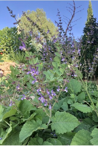 Cette grande Sauge originaire de l'Est du bassin méditerranéen, spontanée en lisière jusqu'à 1900 m d'altitude est une bonne plante pour les jardins secs peu ensoleillés. Elle forme de hautes hampes florales portées bien au dessus de ses larges feuilles d'un beau vert, gaufrées et poilues.