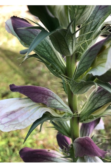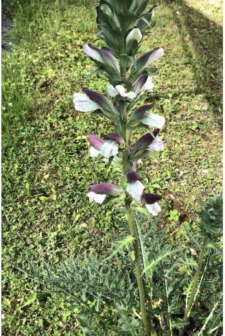 Acanthus hirsutus subsp. syriacus est une plante vivace méditerranéenne originaire de Turquie, Syrie, Liban et Israël, adaptée aux sols calcaires, secs et bien drainés. Elle se développe sur des pentes, falaises et garrigues en plein soleil, tolérant des étés chauds et des hivers modérément frais. La plante forme une touffe érigée de 70 à 120 cm de hauteur avec un feuillage vert foncé, profondément lobé. Ses épis floraux dressés, blanc‑verdâtre avec des bractées rougeâtres, apparaissent au‑dessus du feuillage en été. Son système racinaire vigoureux lui permet de résister à la sécheresse et contribue à son effet architectural dans les massifs ou en isolé.