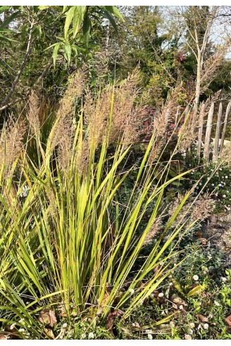 Grande graminée aux épis d'abord pourpres et qui s'ouvrent clairs et denses, son feuillage prend une teinte flamboyante en automne.