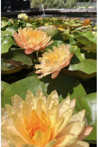 Nénuphar vigoureux à grandes fleurs jaune saumoné doubles, plante idéale pour favoriser par l'ombre de son feuillage l'équilibre d'un bassin, d'un étang ou d'un lac.